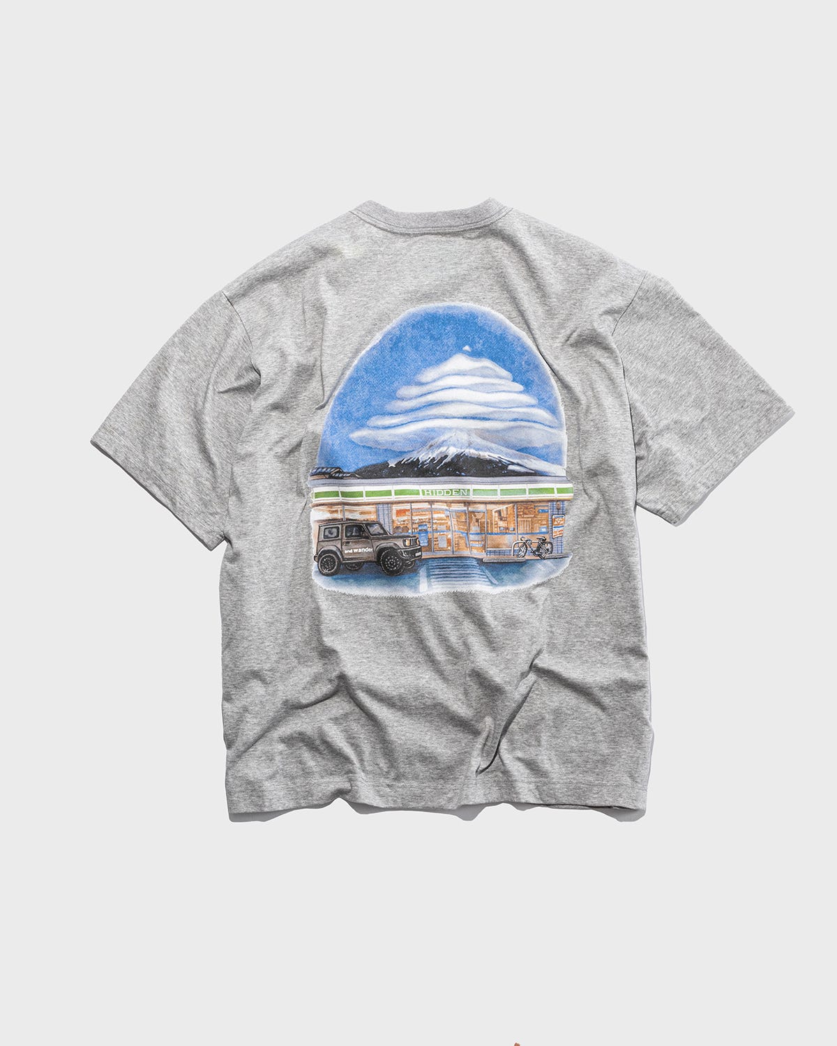 Paying homage to andWANDER’s roots, the Lenticular Tee references the Altocumulus Lenticularis clouds that can form above certain mountains, depicting an idyllic scene of an imaginary HIDDEN konbini located somewhere in the outskirts of Mount Fuji. The hybrid jersey material offers maximum breathability, combining a cotton outer with a COOLMAX inner fabric, and the nylon flap chest pocket on the front referencing classic outdoor jackets.