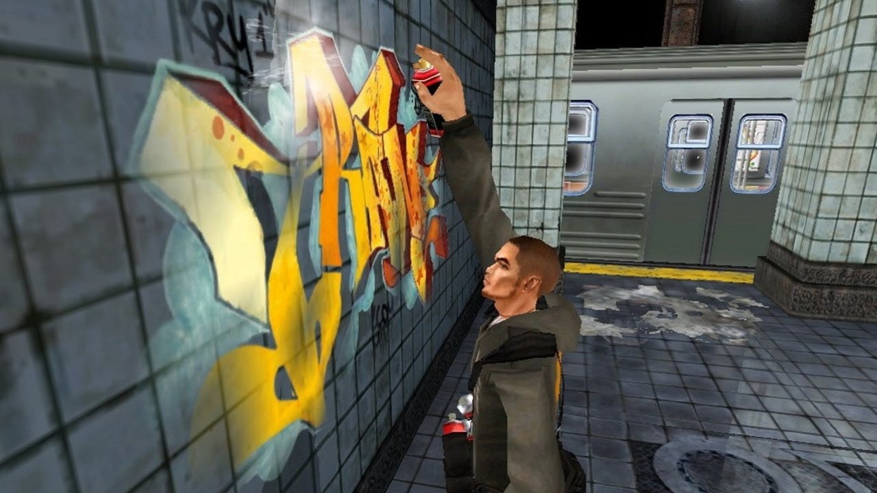 All of those burgeoning subcultures had both a direct and indirect influence on the aesthetics of Jet Set Radio, but it was Marc Ecko who found a way to synthesize them for the American market. Ecko founded Complex magazine in 2002, itself inspired by Japanese magazines (specifically Hot Dog Press, which featured two covers and could be flipped to explore in-depth articles on one side, and a catalog of the month’s coolest items on the other). It tapped into a market where hip-hop, sneakers, streetwear, fashion, and street art were beginning to coalesce. And the next frontier of culture was slated to be video games, a medium that was growing up in unprecedented ways.
