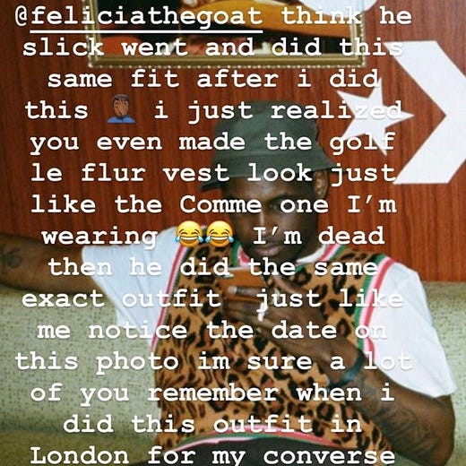 But that hasn’t decreased the mythology around the leopard sweater vest, which has been interpreted by everyone from Supreme to Noah to COMME des GARÇONS. In fact, a leopard print CDG vest became a focal point of A$AP Nast and Tyler, The Creator’s semi-serious fashion beef.